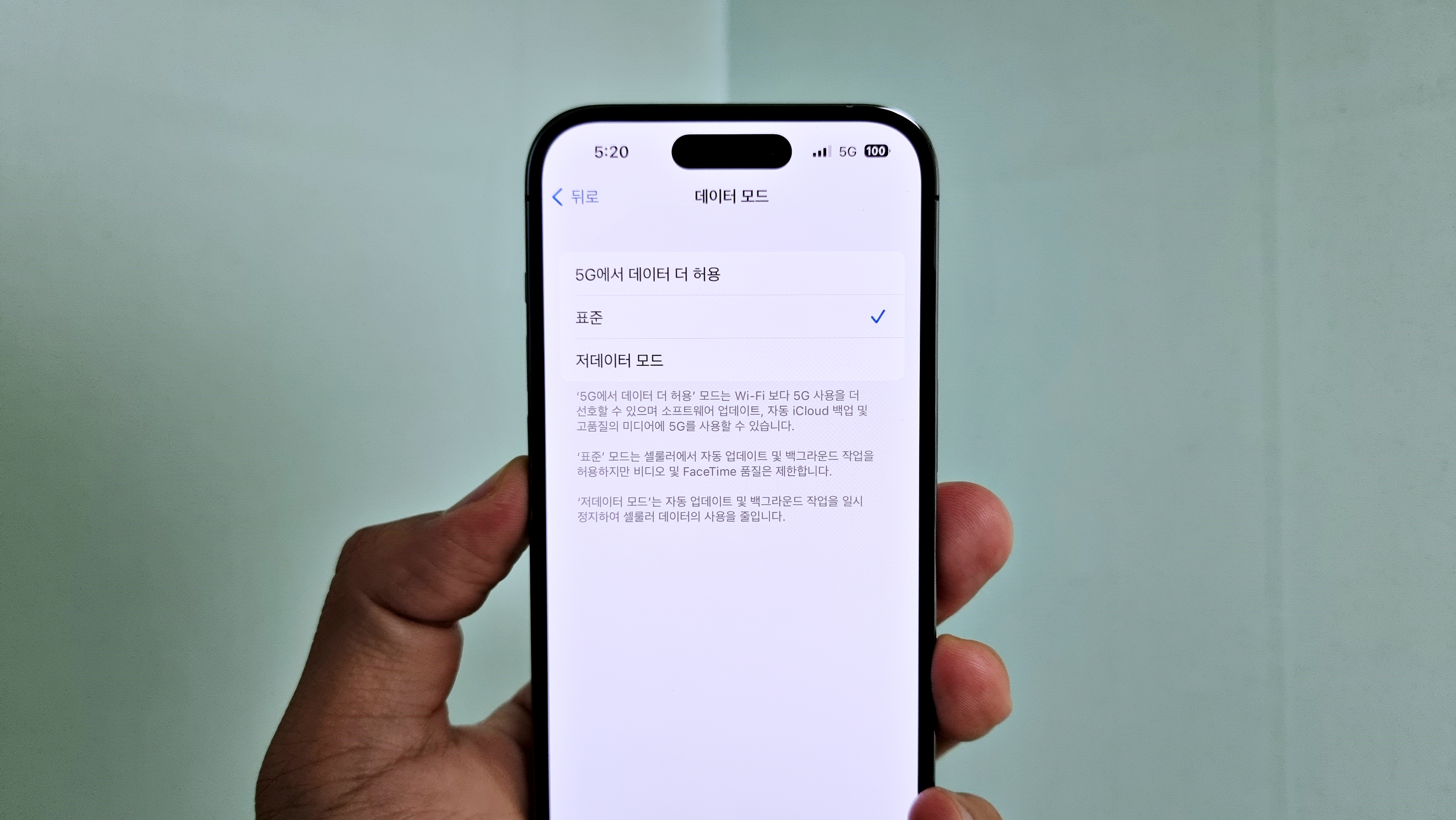 다음은 데이터 모드에 대해 살펴보겠는데 저데이터모드, 표준, 5G에서 데이터 더 허용 3가지가 있습니다. 데이터 모드는 상황에 따라 업데이트 및 백그라운드 작업을 어떻게 할지 설정합니다. 저데이터 모드를 선택하면 셀룰러에서 업데이트 및 백그라운드 작업 사용을 줄여 데이터 사용을 적게 합니다.