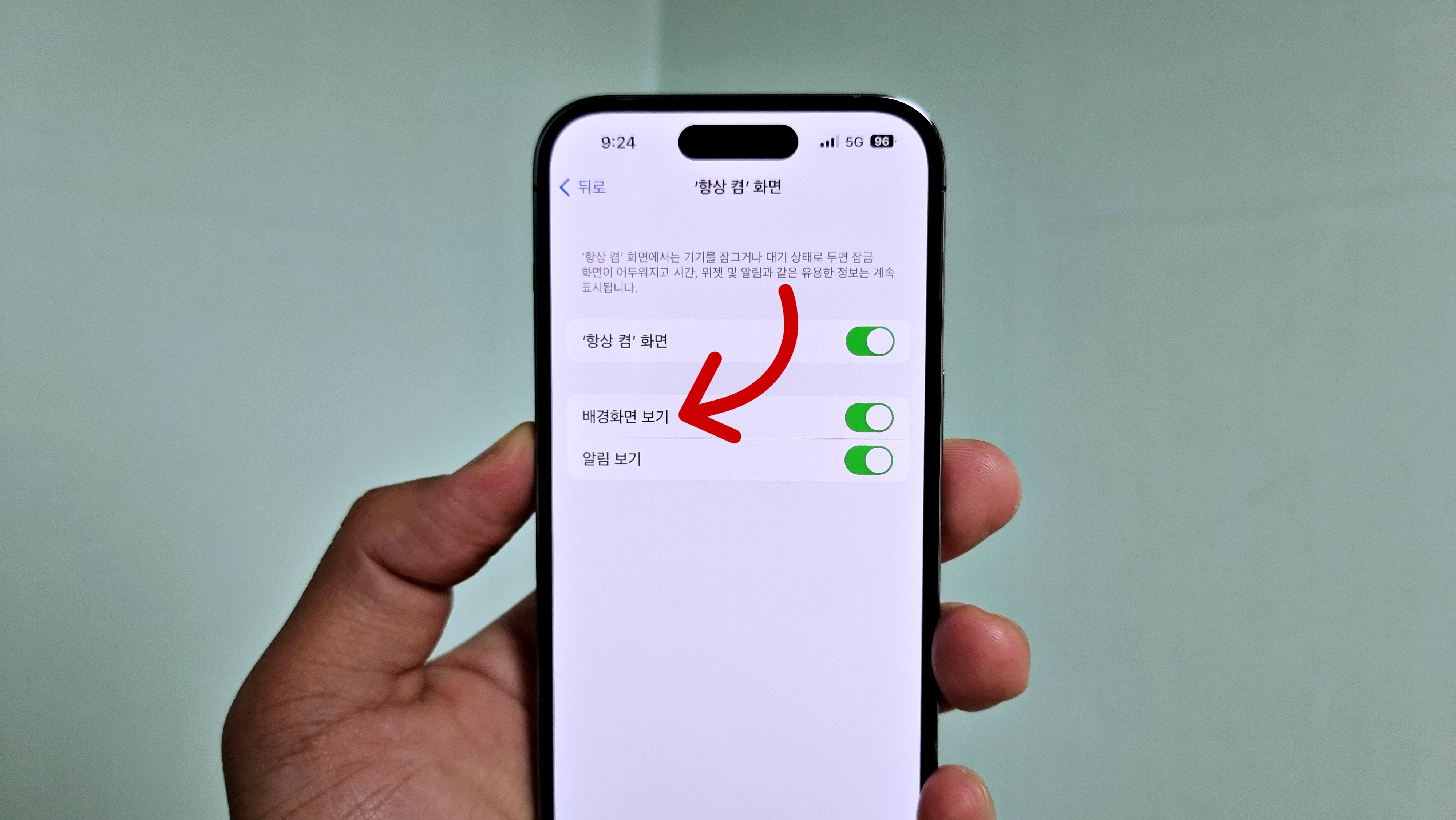 처음에 AOD라는 단어를 한참 찾았지만 찾을 수 가 없었는데, AOD 대신 항상켬이라는 한글로 번역해 사용하네요. '항상 켬' 화면에서 AOD 설정을 변경할 수 있습니다.