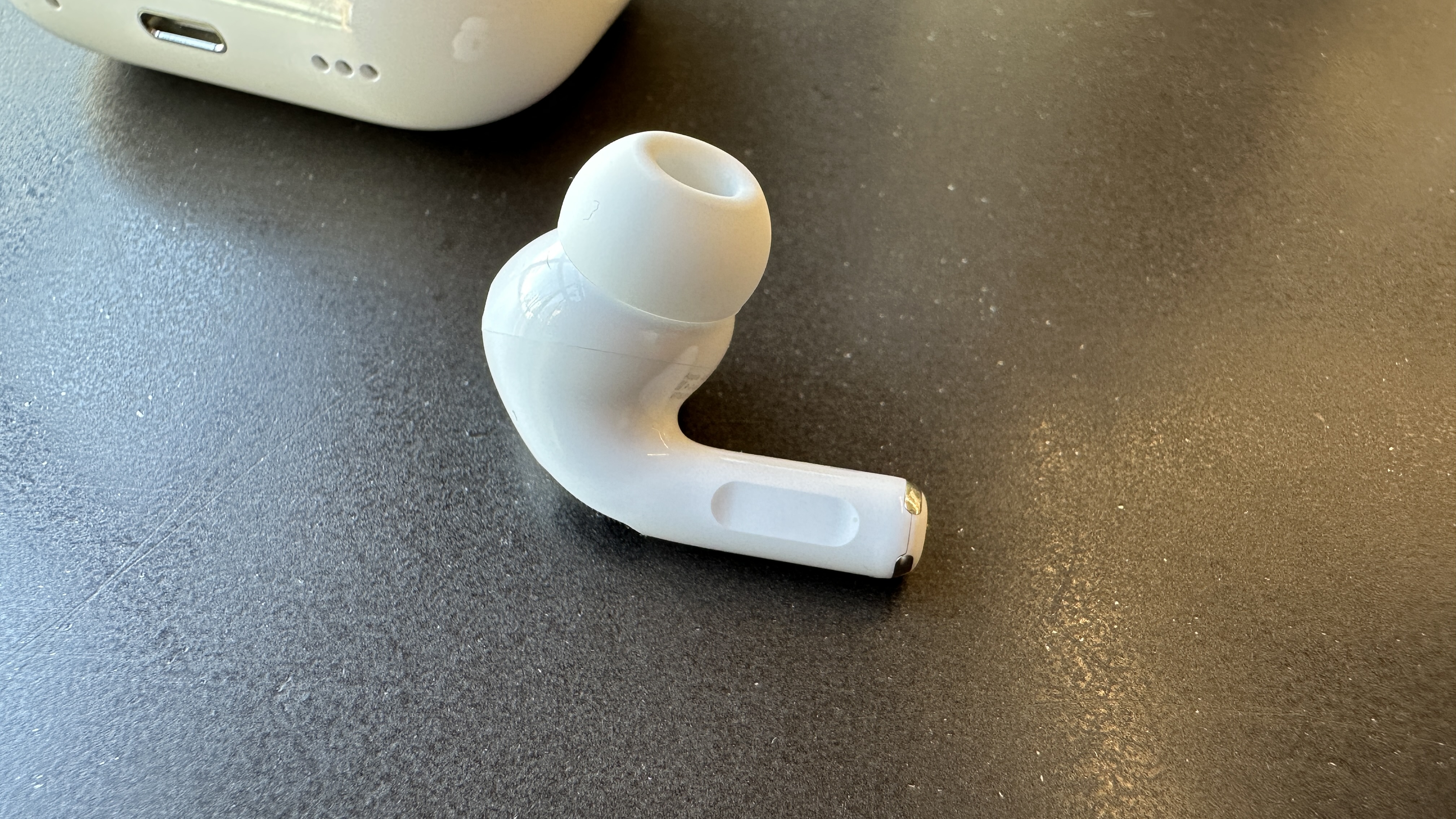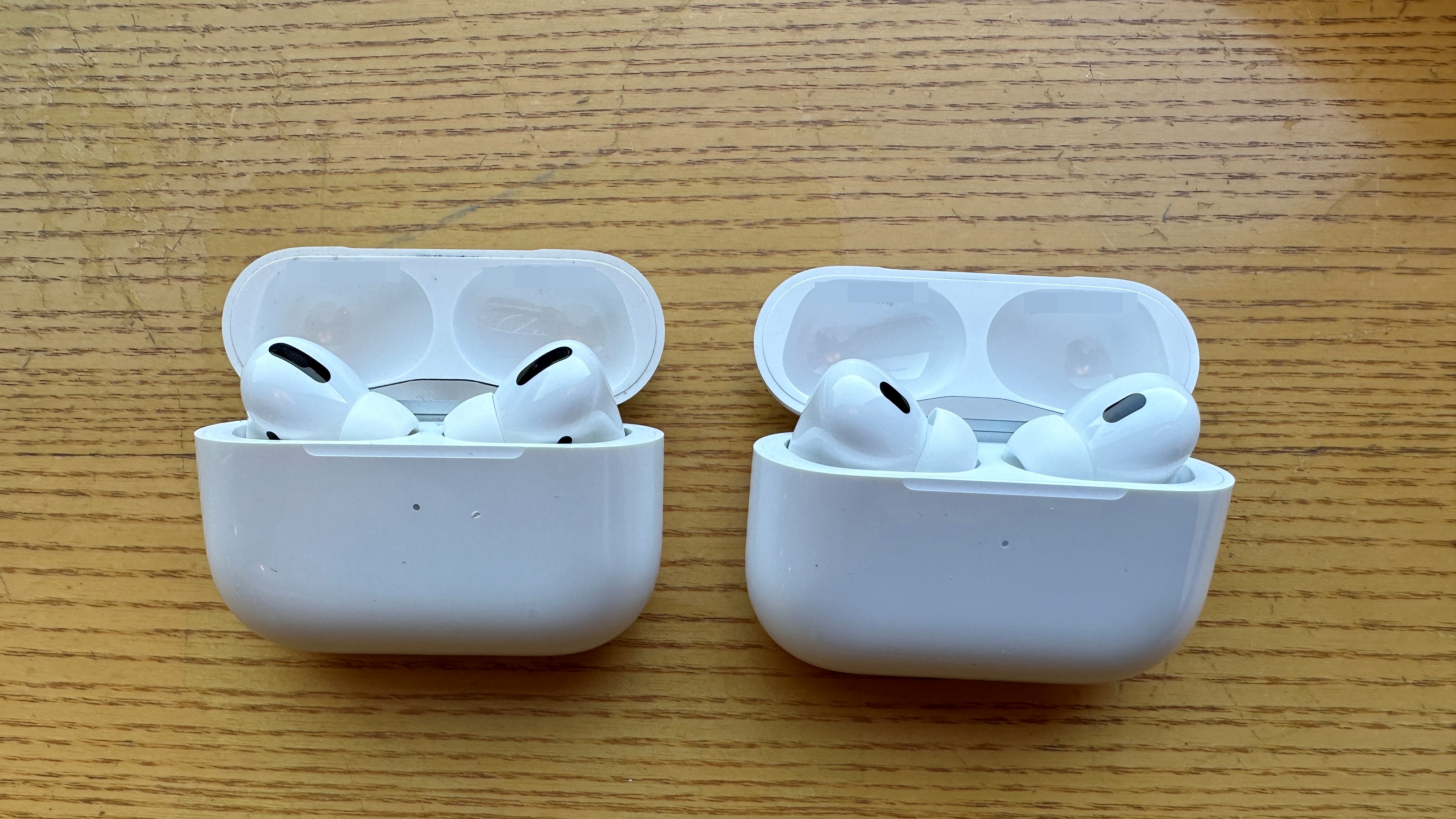 와이프가 에어팟 프로 1세대를 사용하고 있어 간단하게 비교를 해봤습니다. 충전 케이스를 보면 에어팟 프로 2세대 측면에 고리를 걸 수 있는 부분이 있고, 아래쪽에는 스피커가 들어가 있습니다. 스피커를 통해 충전 케이스 위치를 확인할 수 있어, 이제 에어팟이 안보일 때 쉽게 찾을 수 있습니다.