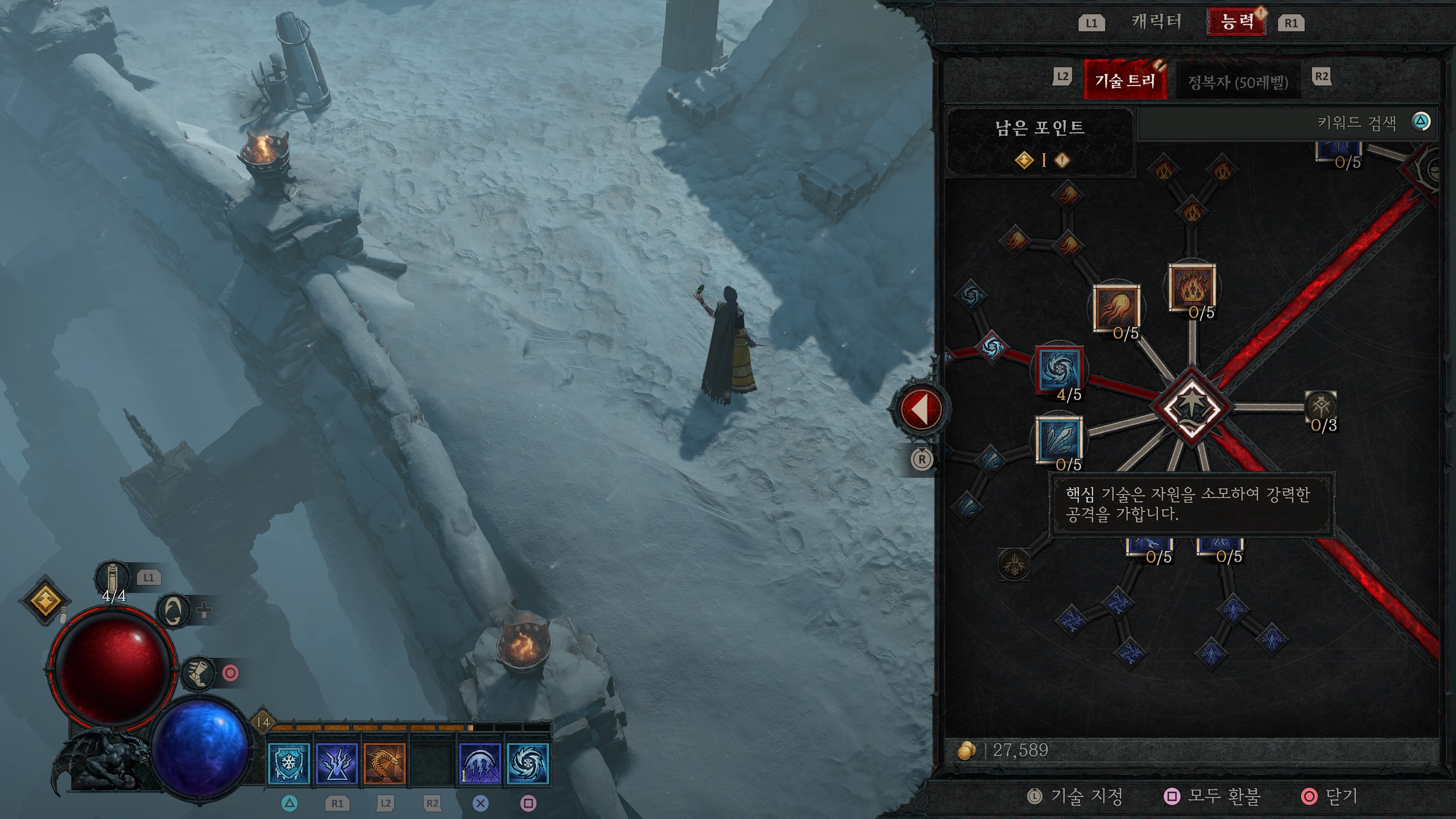 바바리안을 좋아하긴 하지만, 디아가 전통적으로 근접 캐릭터가 초반에 좋지 못해 소서리스로 게임을 했습니다. 기술트리는 디아블로2와 같이 스킬포인트가 부여돼 스킬을 선택해 사용할 수 있으며, 스킬 별로 세부 스킬 선택을 할 수 있는데 이부분은 디아블로3에서 봤던 스킬 룬과 비슷합니다. 한 번 선택한 스킬을 계속 사용해야 하는건 아니고 골드를 사용해 스킬을 초기화 할 수 있습니다.