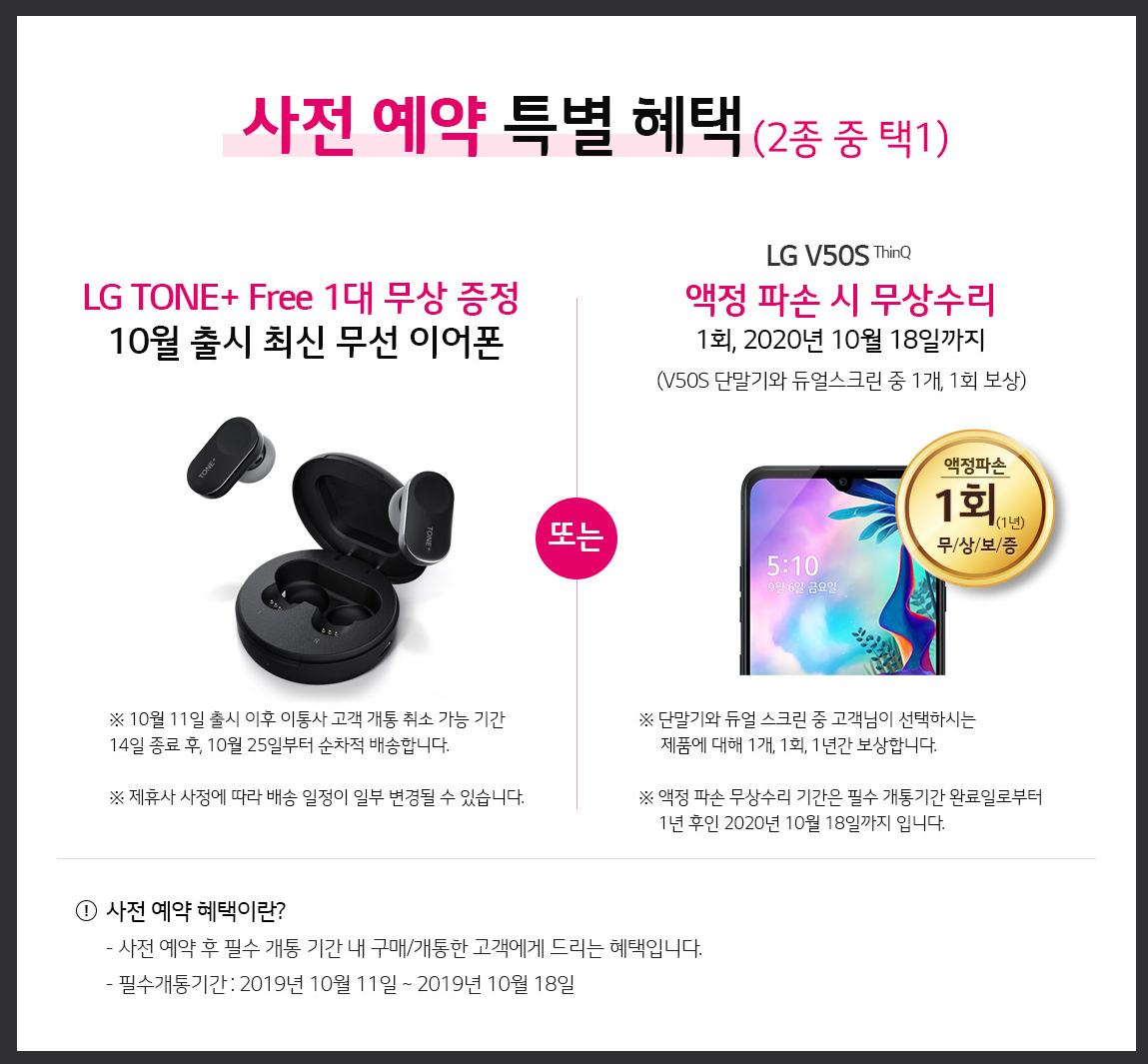 LG V50s 사전예약 중입니다. 기간은 2019년 10월 4일에서 10월 10일까지입니다. 그리고 사전예약을 하면 드리는 특별한 혜택이 있습니다.