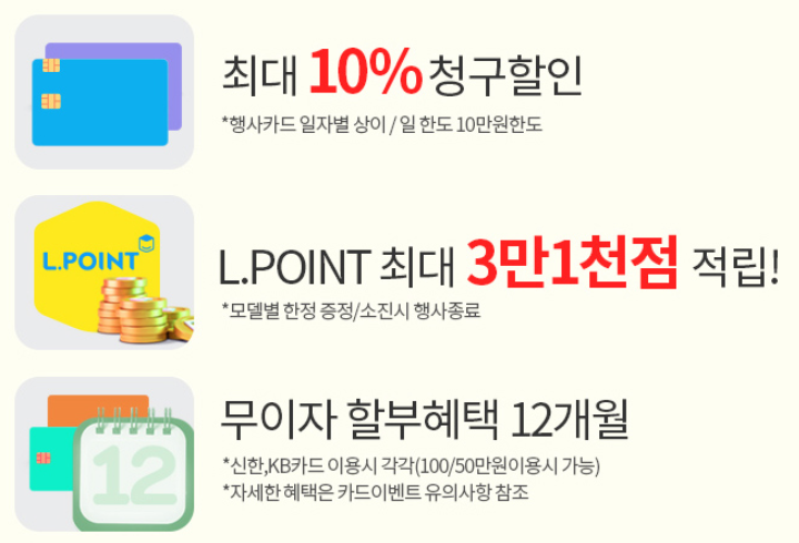 최대 10% 청구할인 / L포인트 적립 / 무이자 혜택 12개월 / 엔젤리너스 쿠폰 증정