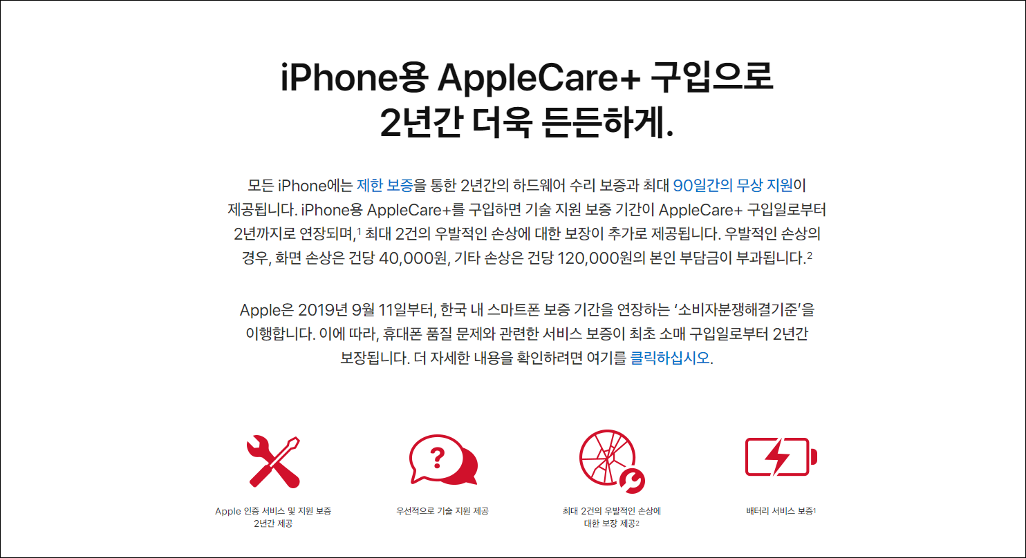 사용자의 과실 없이 제품에 이상이 있을 경우 2년 동안 AS를 받을 수 있지만, 사용자의 과실이 있을 경우는 해당이 되지 않습니다. 그래서 아이폰을 사용한다면 보험 가입이 필수라 생각됩니다. 통신사를 통해 보험을 가입하는 방법도 있지만, 애플에서 제공하는 보험 서비스가 있습니다. 애플케어플러스인데, 소비자의 과실이 있어도 저렴한 가격에 수리를 받거나 리퍼를 받을 수 있습니다. 얼마 전까지는 한국에서 정식 서비스가 되지 않아 해외 사이트를 통해 가입을 했습니다. 하지만 아이폰11이 출시되면서 국내에서 정식 서비스가 되고 있습니다.