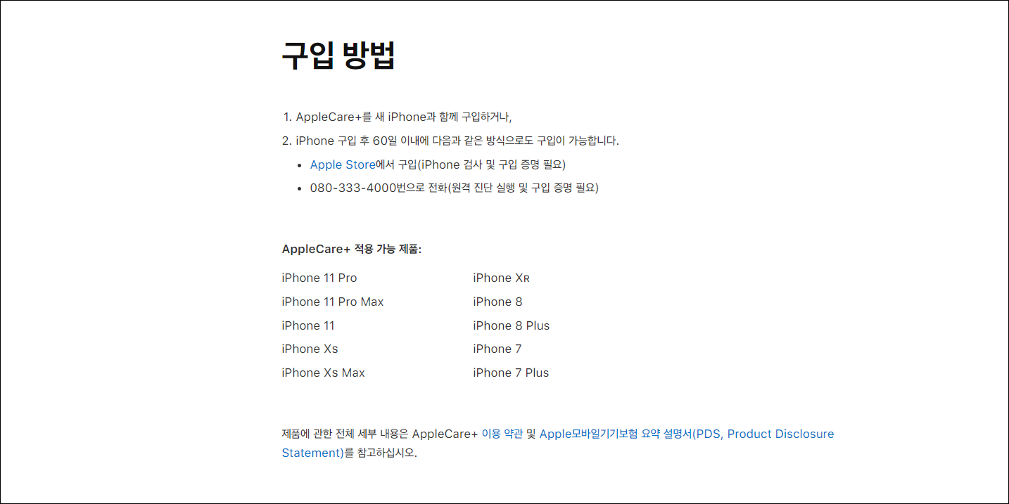 애플 홈페이지, 애플 스토어, 전화를 통해 가입이 가능한데 한국에서는 애플 홈페이지를 통한 가입이 제한적입니다. 애플 홈페이지에서 아이폰을 바로 구매할 경우 애플케어 플러스를 선택해 구매가 가능합니다. 다만 쿠팡이나 하이마트 등 다른 판매처를 통해 구매를 한경우는 애플 홈페이지를 통한 가입이 안됩니다. 그래서 애플 스토어에 가거나 전화를 통해 가입을 해야 합니다. 저는 지방에 있어 애플 스토어를 갈 수는 없어 전화로 가입을 신청했습니다.