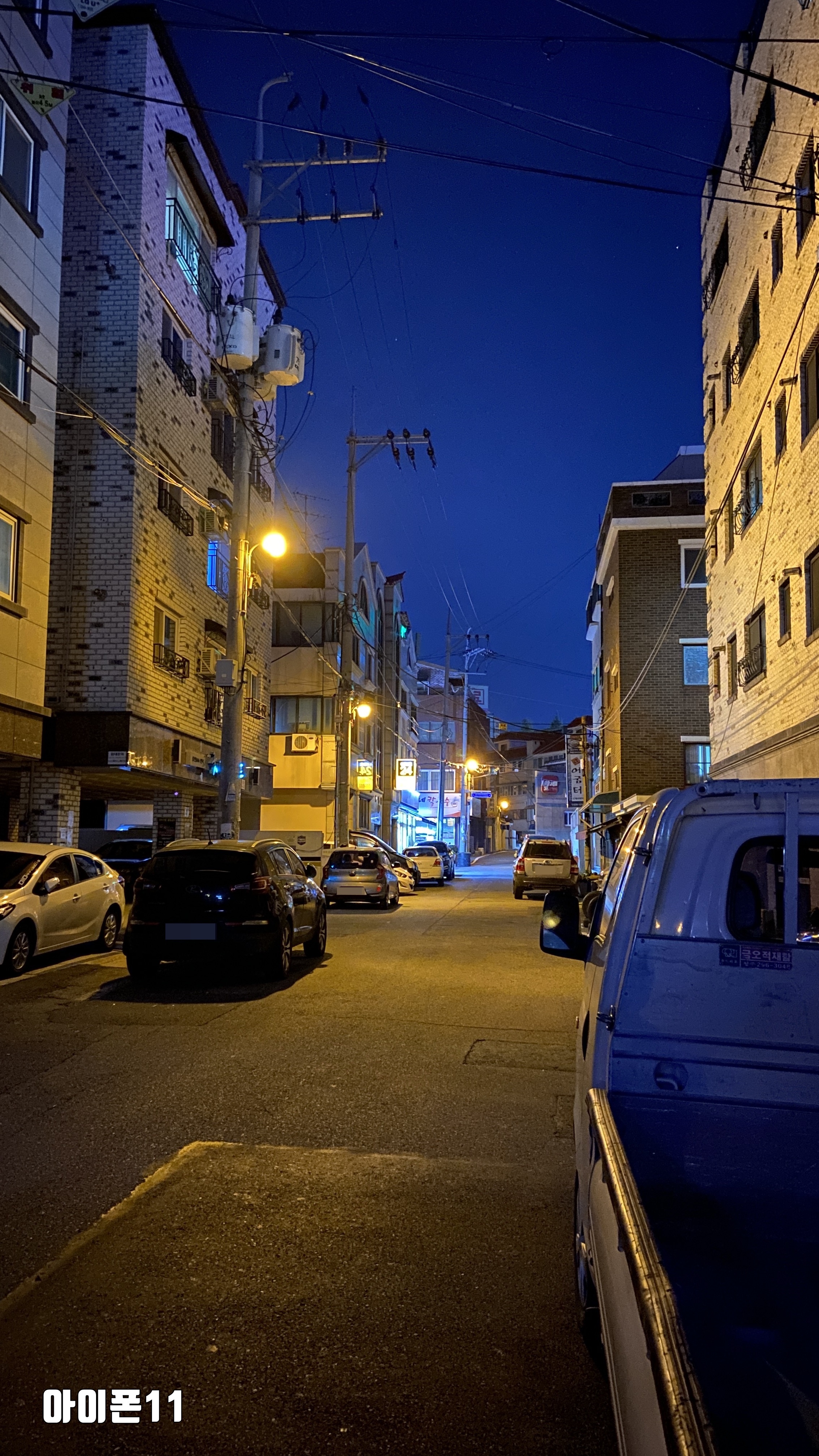 사진을 언뜻 보기에는 비슷한 느낌이지만 아이폰11의 사진에서 디테일이 좀더 살아 있습니다. 특히 사진 중앙의 편의점 부분을 보면 아이폰11 사진이 더욱 또렷합니다.